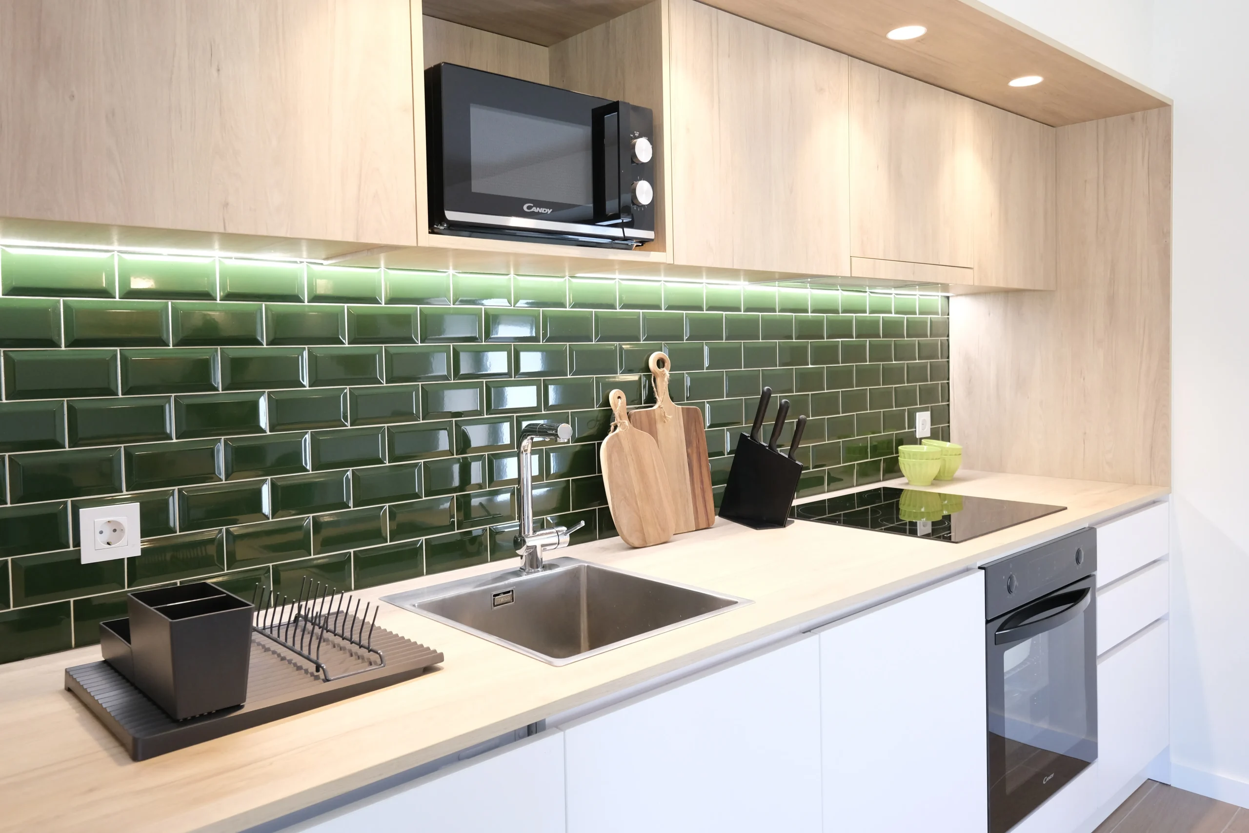 A cozinha aberta está equipada com forno, fogão, micro-ondas, frigorífico e utensílios essenciais, proporcionando tudo o que precisa para preparar refeições.